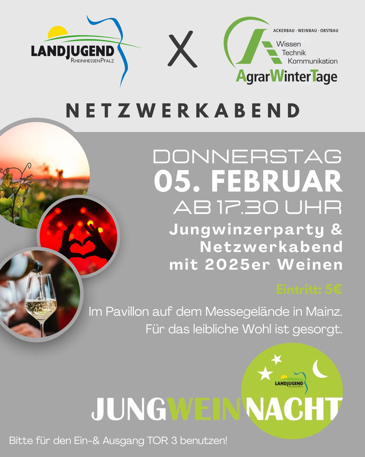 Die Rheinhessischen Jungwinzer*innen der Landjugend laden zur beliebten Jung.Wein.Nacht im Rahmen der AgrarWinterTage ein. Es erwartet dich ein Abend mit frischen 2025er-Weinen, DJ-Musik und guter Stimmung!