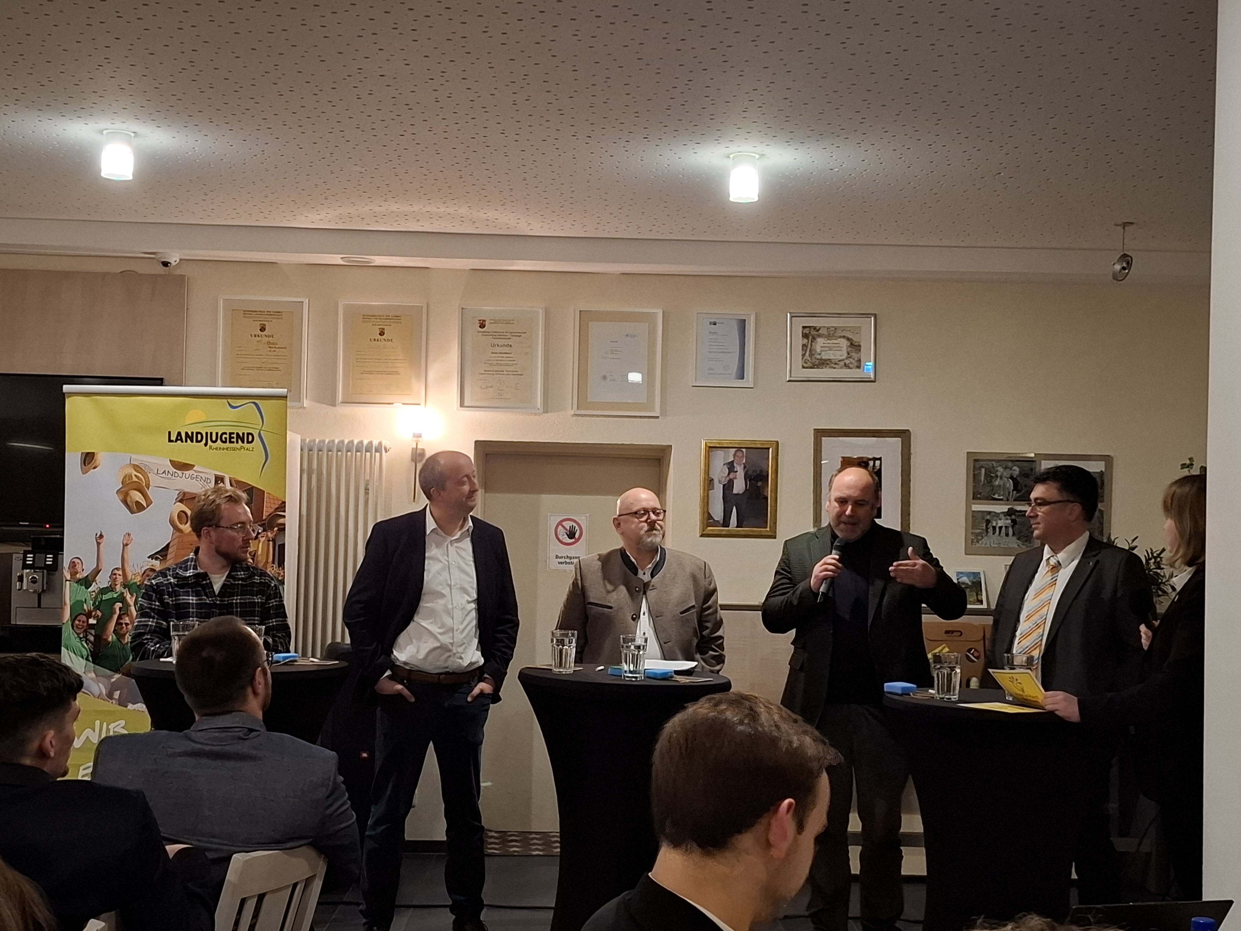 Im Anschluss gab es in lockerer Atmosphäre noch einmal die Gelegenheit, in ein persönliches Gespräch mit den Politikern zu gehen. Der Abend wurde von Katharina Rößler, 1. Vorsitzende der Landjugend RheinhessenPfalz, und Fabian Schüller, 1. Vorsitzender der Landjugend Rheinland-Nassau, mit einem großen Dankeschön an alle Teilnehmenden und der Aufforderung, am 22. März wählen zu gehen, beschlossen.