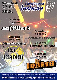 Das nächste Highlight steht vor der Tür: Das Insheimer Weinfest (27.-30.8.2010). Die Landjugend Insheim ist auch dieses Jahr wieder mit einem Hof dabei. Wir bewirten Euch mit schmackhaften Essen und allerlei Getränken, die Ihr im Ausschank sowie an einem Stand und unserer Bar erhaltet. Am Kerwessonntag und am Kerwemontag bieten wir wieder Mittagessen an, sonntags außerdem Kaffee und Kuchen.