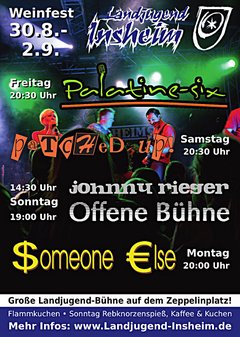 Montags rockt $omeone €lse die Landjugend-Bühne. Die Band bietet ein vielfältiges Programm von A wie "Africa" (von Toto) bis Z wie "Zu spät" (von den Ärzten). Mit den Rock & Pop Hits der letzten 4 Jahrzehnte spricht $omeone €lse ein breites Publikum an und begeistert gleichermaßen Jung und Alt. Die Band warnt auf ihrer Homepage, dass nach einem Abend mit $omeone €lse häufig ein Tag mit Muskelkater und Heiserkeit folgt - zumindest letzteres sollte sich durch einen guten Schoppen vermeiden lassen.