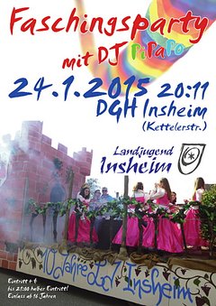 Die Landjugend Insheim lädt alle, die gern feiern, zur Faschingsparty ins Dorfgemeinschaftshaus Insheim (Kettelerstraße) ein. Die Party beginnt am Samstag, 24.1. um 20:11 Uhr.