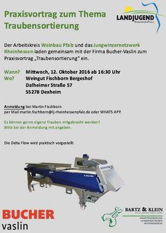 Der Arbeitskreis Weinbau Pfalz und das Junwinzernetzwerk Rheinhessen laden mit der Firma Bucher-Vaslin zum Praxisvortrag "Traubensortierung" ein. Die Delta Flow wird dabei praktisch vorgestellt. Es können gerne eigene Trauben mitgebracht werden. Bei der Anmeldung bitte mit angeben!