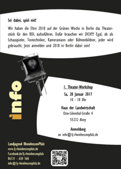 Wir haben die Ehre 2018 auf der Grünen Woche in Berlin das Theaterstück für den BDL aufzuführen. Dafür brauchen wir DICH!!! Egal, ob als Schauspieler, Tontechniker, Kameramann oder Bühnenbildner, jeder wird gebraucht. Jetzt anmelden und 2018 in Berlin dabei sein!