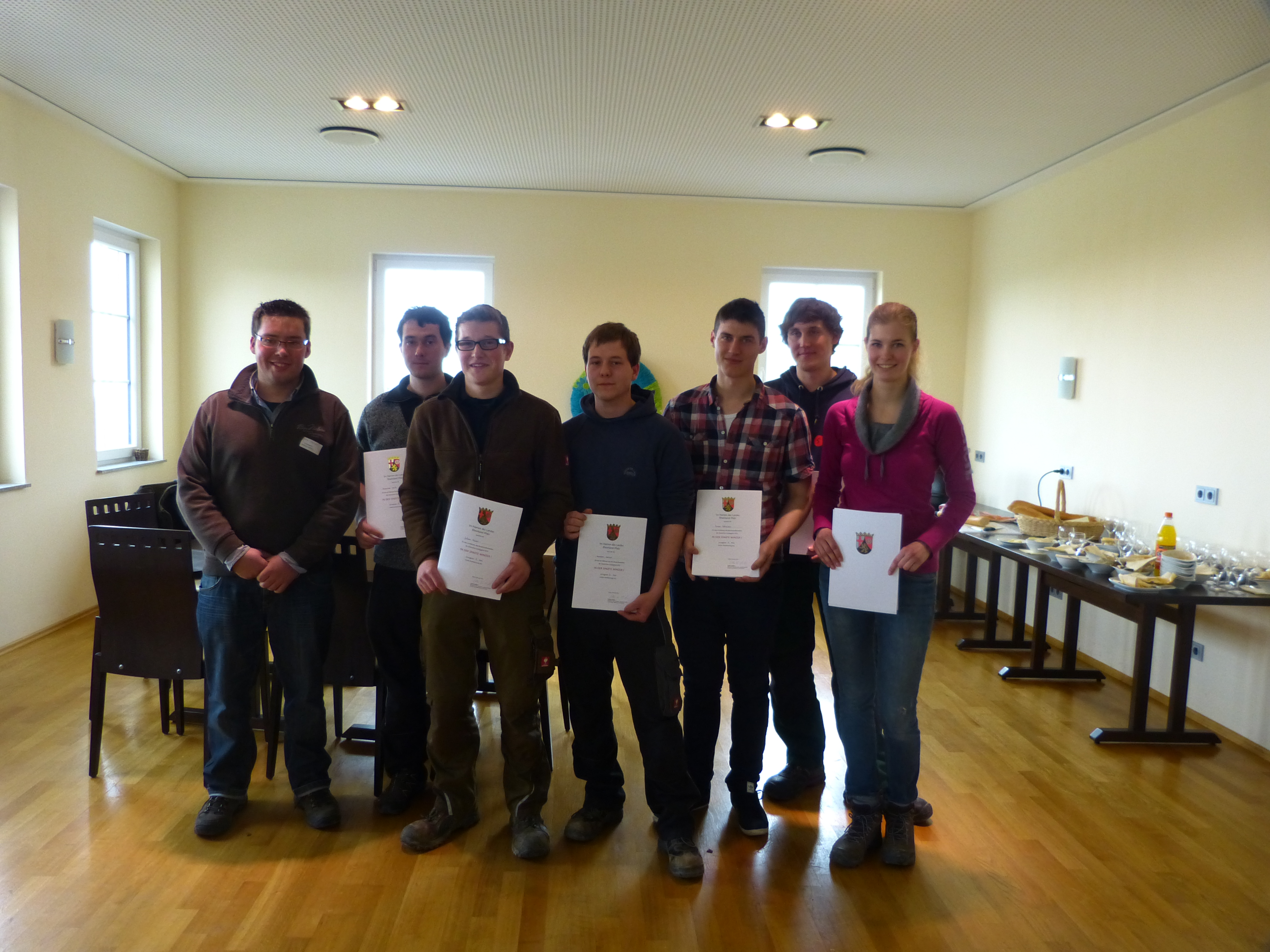 Schließlich konnten nach einem vielseitigen Vormittag die Gewinner des Gebietsentscheids verkündet werden. In Rheinhessen belegte Simon Schreiber Platz 1, Karsten Horter Platz 2 und Sina Steinfurth Platz 3. Von der Pfalz dürfen sich Julian Moser (Platz 1), Thomas Andres (Platz 2) und Alexander Koch (Platz 3) die Sieger nennen. Martin Fischborn (Vorsitzender der Landjugend RheinhessenPfalz) gratulierte den Bestplatzierten und überreichte ihnen mundgeblasene Weingläser, sowie den Gutschein für die Siegerfahrt, die spartenübergreifend mit allen Gewinnern der Berufswettbewerbe aus Land- Forst-, Haus- und Tierwirtschaft sowie aus dem Weinbau stattfinden wird.