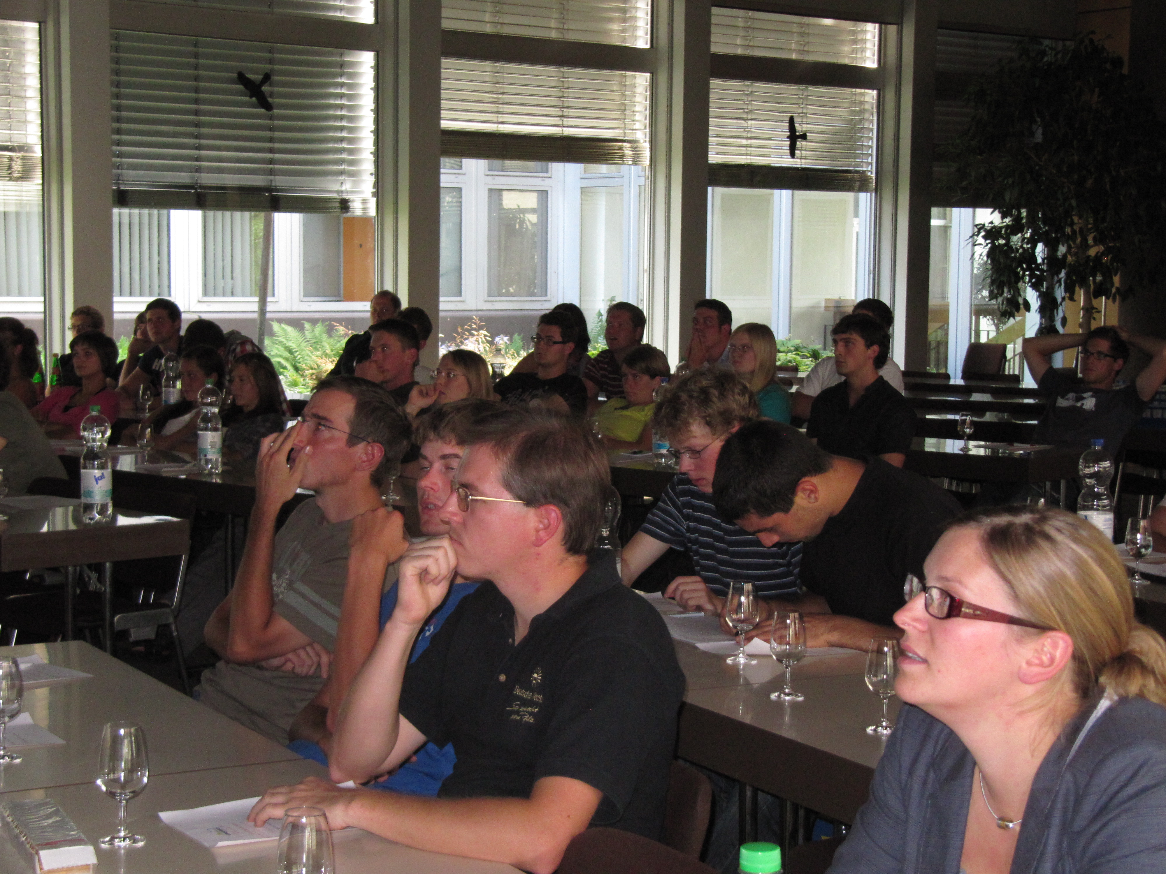 Über 60 Studierende und Jungwinzer der Pfalz nahmen an dem dreistündigen Programm in der Aula des DLR teil. Großes Interesse herrschte am Vortrag von Bernd Weik, der wichtige Fakten zu Auswirkungen der Frost- und Hagelschäden, zu Reifeverläufen, zu Niederschlagswerten, zur Aromabildung und zu Erziehungsformen lieferte.
