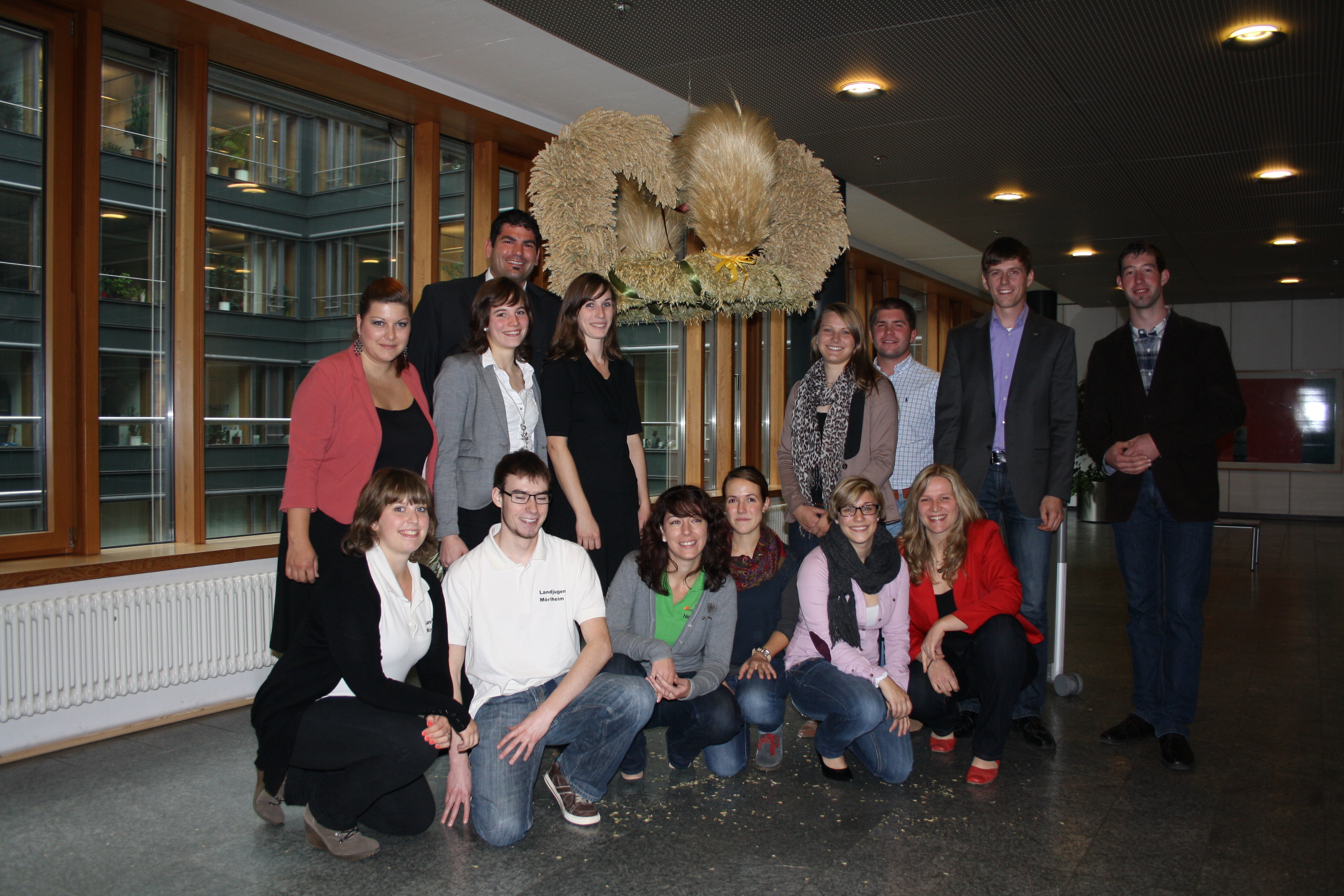 „Mit dieser Erntekrone als Zeichen der Dankbarkeit für die weitestgehend abgeschlossene Ernte möchten wir die Verbundenheit der Landwirte und Winzer mit der Natur darstellen. Trotz sehr schwieriger Startbedingungen in diesem Jahr durch die sehr starken Frostschäden im Frühjahr verbunden mit zum Teil sehr deutlichen Ertragsausfällen bis hin zu umfangreichen Neuaussaaten insbesondere im Getreide- und Rapsanbau habe doch noch eine im Schnitt meist gute Ernte eingebracht werden können“, so Barbara Bißbort, Vorsitzende der Landjugend RheinhessenPfalz Mitte Oktober in Mainz. Die Winzer seien noch in der Lese und daher leider dieses Mal nicht mit dabei. Die Landjugendgruppe Mörlheim hatte die sehr schöne Erntekrone in mühevoller Arbeit gebunden und übergab sie für die Arbeitsgemeinschaft der Landjugendverbände an Staatssekretär Dr. Griese, der Ministerin Höfken vertrat. Dr. Griese betonte, wie gerne er gerade diesen Termin war nehme, da er selbst ehemaliger Landjugendlicher sei. Die Erntekrone schmückt jetzt den Eingang des Ministeriums für Umwelt, Landwirtschaft, Ernährung, Weinbau und Forsten.
