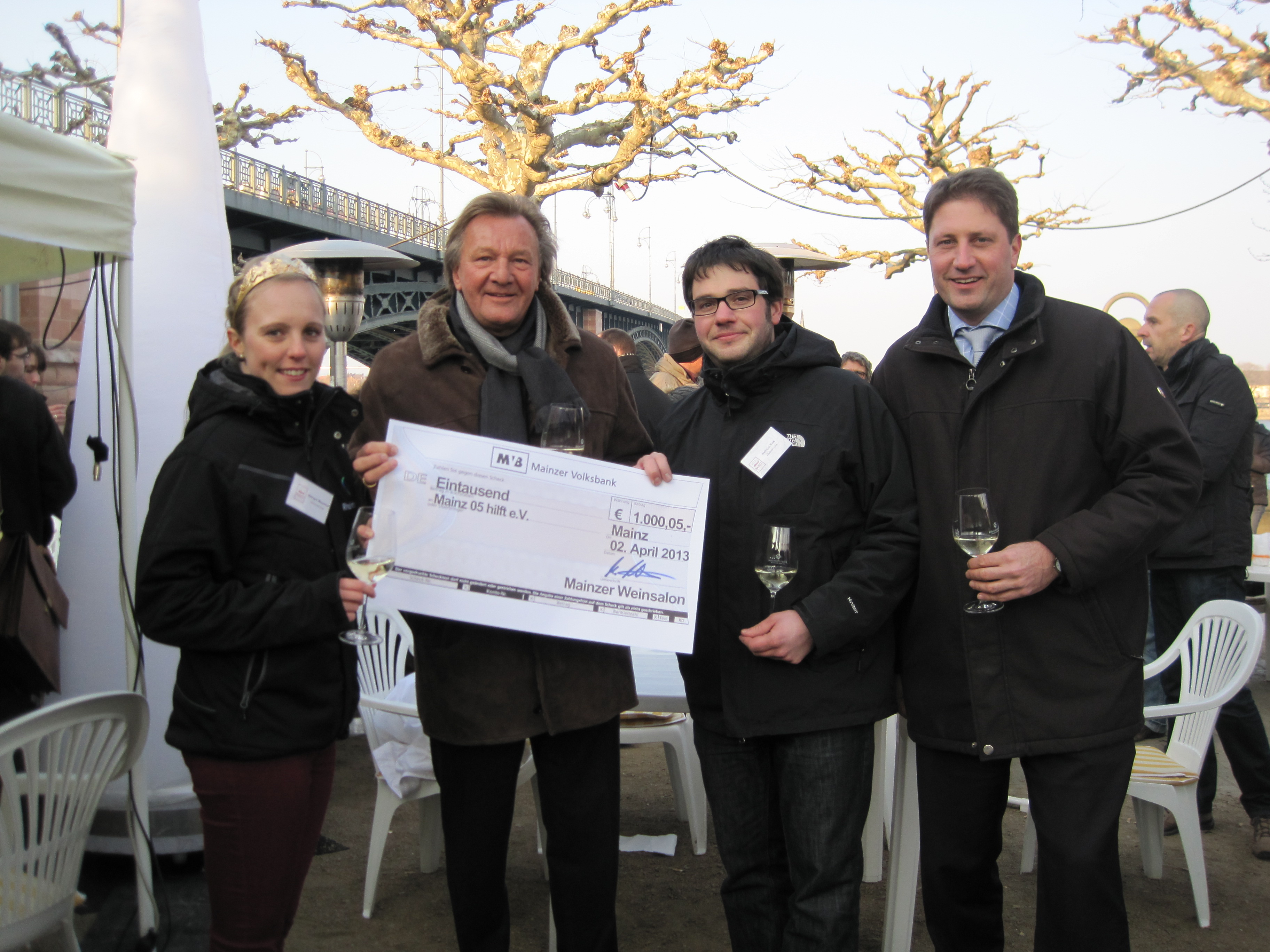 Am vergangenen Dienstag feierte der Mainzer Weinsalon mit zahlreichen Besuchern am Brückenkopf seinen vierten Geburtstag. Die rheinhessischen Jungwinzer bedachten mit ihrer jährlichen Spende diesmal die Initiative Mainz 05 hilft e.V. und überreichten sie dem Präsidenten Harald Strutz persönlich.